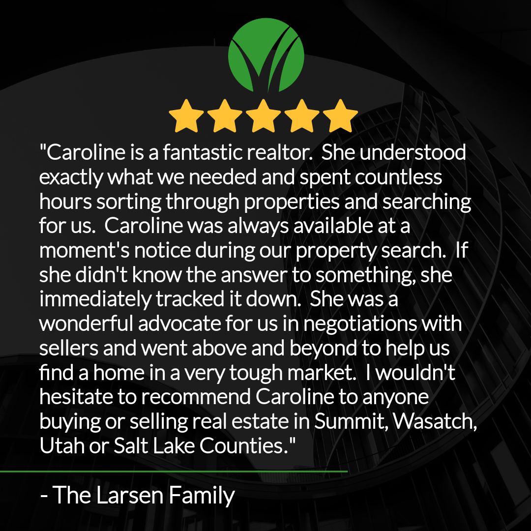 "Caroline is a fantastic realtor! She understood exactly what we needed and spent countless hours sorting through properties and searching for us. Caroline was always available at a moment's notice during our property search. If she didn't know the answer to something, she immediately tracked it down. She was a wonderful advocate for us in negotiations with sellers and went above and beyond to help us find a home in a very tough market. I wouldn't hesitate to recommend Caroline to anyone buying or selling real estate in Summit, Wasatch, Utah or Salt Lake Counties."