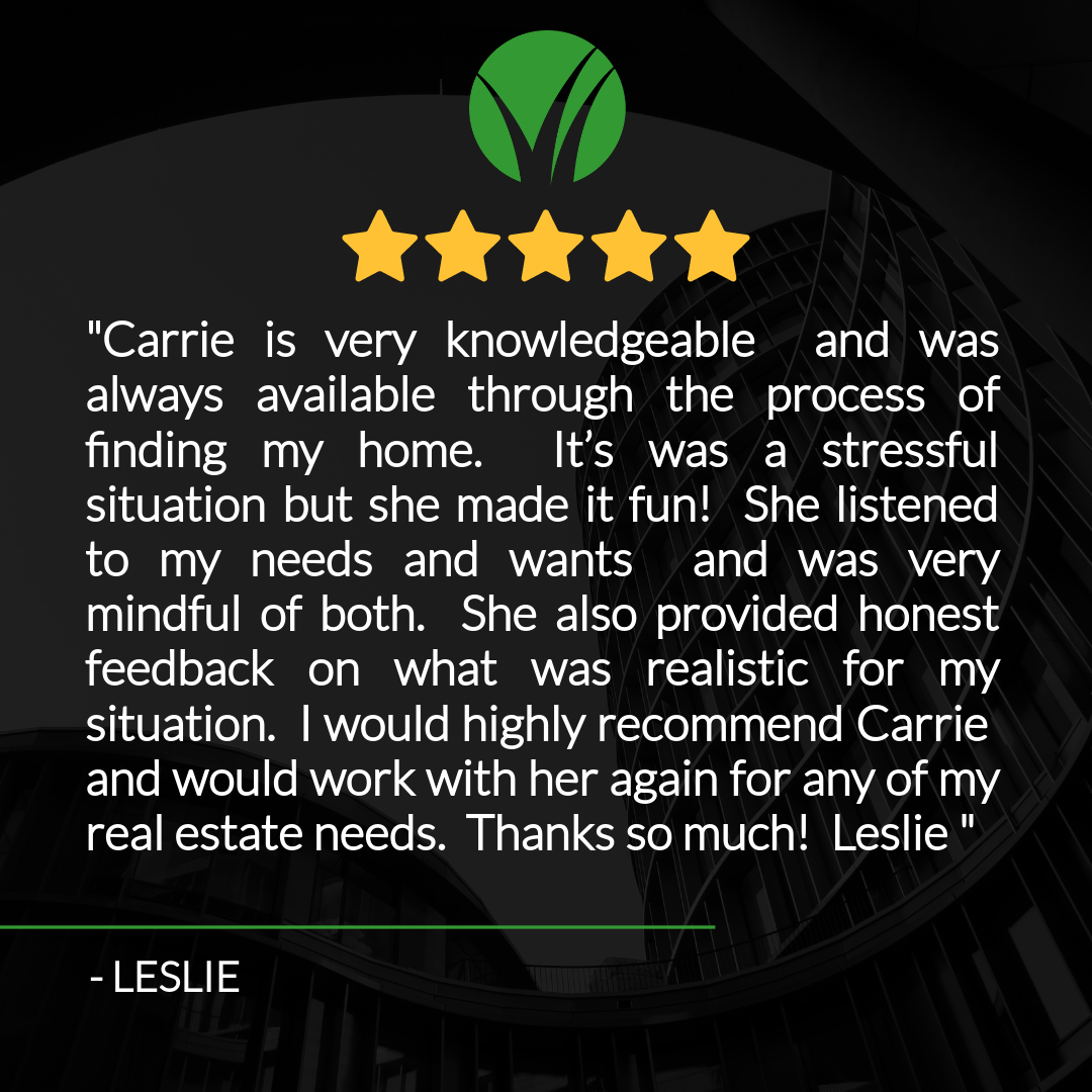 "Carrie is very knowledgeable and was always available through the process of finding my home. It was a stressful situation but she made it fun! She listened to my needs and wants and was very mindful of both. She also provided honest feedback on what was realistic for my situation. I would highly recommend Carrie and would work with her again for any of my real estate needs. Thanks so much! Leslie "